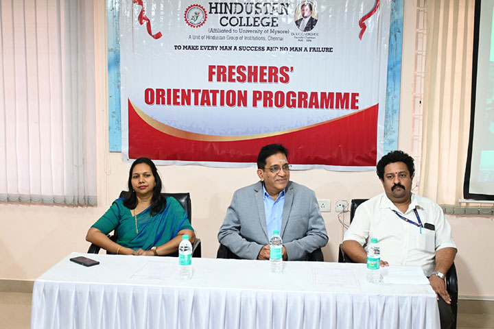 The Department of Commerce organized a two-day Freshers’ Orientation program on 3rd and 4th July, 2025, for the first-year B.Com students. The Principal addressed the students, encouraging them to approach college life with discipline, enthusiasm, and active participation beyond the classroom. The Chief Guest, Mr. S Ranganathan, Chief Finance Officer, Automotive Axles Ltd., Mysore, inspired students with practical insights. He emphasized the importance of skill development and advised students to learn tools such as SAP and gain hands-on experience in accounting and GST practices.
