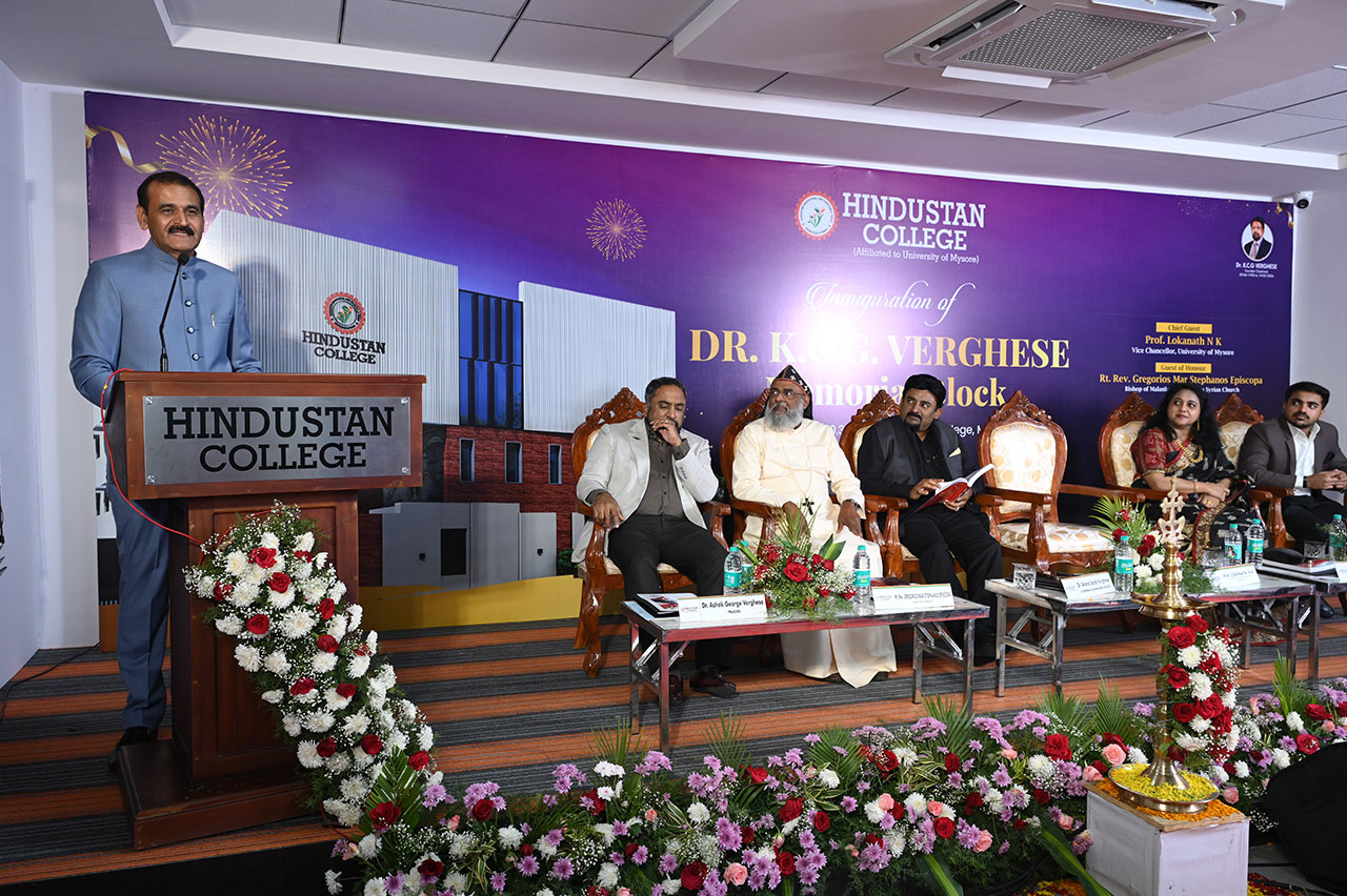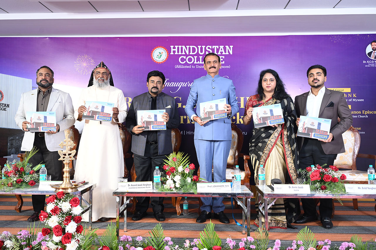 The Inauguration of the Dr. K. C. G. Verghese Memorial Academic Block, an adjacent building in the premises of the college, was organized on 7th March 2026. The program commenced with a vibrant traditional welcome through ‘Dollu Kunitha’, setting a festive and cultural tone for the occasion, which was followed by the unveiling of the “Wings of Wisdom”, a mural by Prof. Lokanath, Vice Chancellor, University of Mysore, symbolizing knowledge, growth, and academic excellence. The highlight of the event was the formal inauguration of the Dr. K. C. G. Verghese Memorial Academic Block by the Chairman, along with the Chief Guests. The commemorative plaque was unveiled by Dr. Anand Jacob Verghese, Chairman, HGI, adding a moment of reverence and significance to the occasion. The formal function held at the Seminar Hall began with a video presentation showcasing the achievements and vision of the Hindustan Group of Institutions. Dr. Anand Jacob Verghese, Chairman of HGI, delivered the Presidential Address, highlighting the institution’s commitment to excellence in education and infrastructure development. A felicitation ceremony was held in honour of key contributors, with Dr. Anand Jacob Verghese and Dr. Ashok George Verghese, Vice President, HGI, addressing the gathering and acknowledging the efforts behind the successful completion of the memorial block. The Guest of Honour, Rt. Rev. Gregorios Mar Stephanos Episcopa addressed the audience with inspiring words. Dr. Priya C. J, Principal of Hindustan College, introduced the Chief Guest, Prof. Lokanath, who delivered an insightful address emphasizing the importance of quality education and institutional growth. An MoU exchange ceremony was conducted between Dr. Anand Jacob Verghese, Chairman of HGI, and Mr. Anil Basotra, Director of KTC Holdings India Pvt. Ltd., marking a step towards future collaboration. The dignitaries also released the decennial Souvenir, commemorating a decade of achievements. The event was also graced by Mr. Enid Verghese, Deputy Director, HGI, Dr. Annie Jacob, Trustee, HECT, Mr. Samarjeet Gupta, Ms. Anita Gupta, Mr. David Ryan, Management Executive, HGI, Mr. Aby Sam, Executive Director, HITS, Mr. Manoharan, Director–Projects, HITS, Mr. Rajaram, IAS Advisor; Mr. Rangaswamy, Auditor, and Mr. Vivek Reddy, Resident Executive. The program included the presentation of mementos to the contractors in recognition of their contributions to the construction of the memorial block. The event concluded with a closing benediction by Rt. Rev. Gregorios Mar Stephanos Episcopa. Ms. Savitha K. V., Assistant Professor, delivered the Vote of Thanks, expressing gratitude to all dignitaries, organizers, and participants for making the event a grand success.
