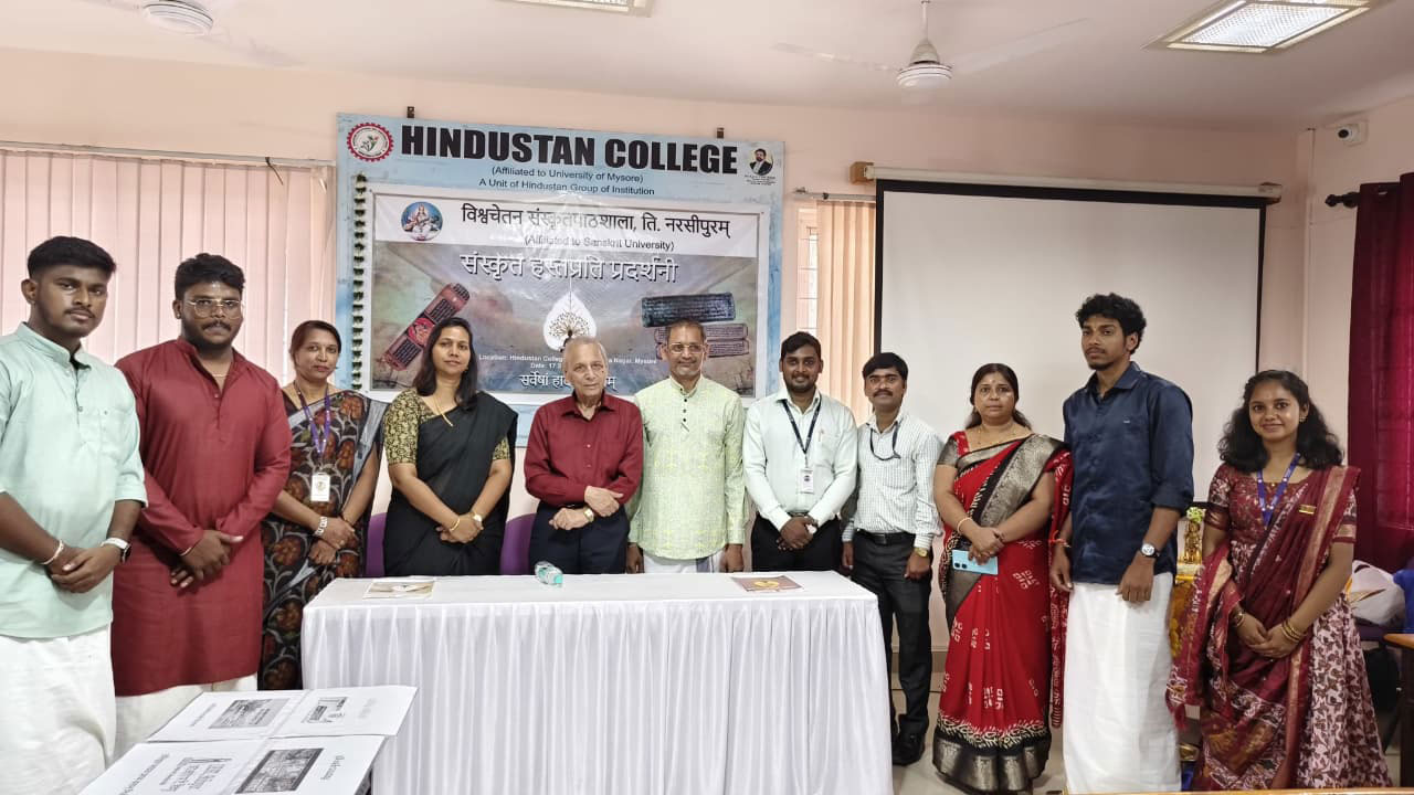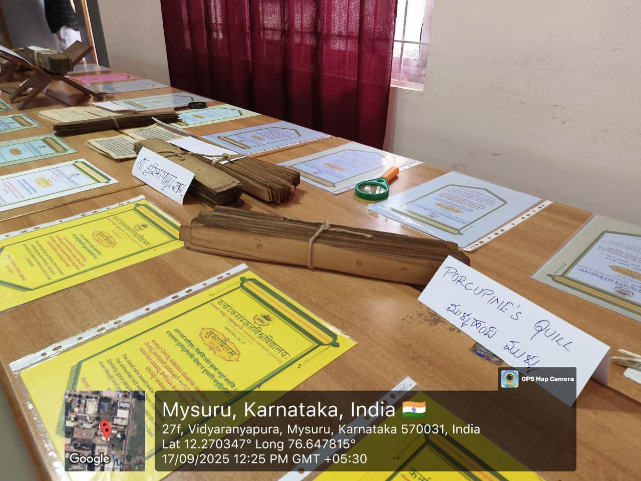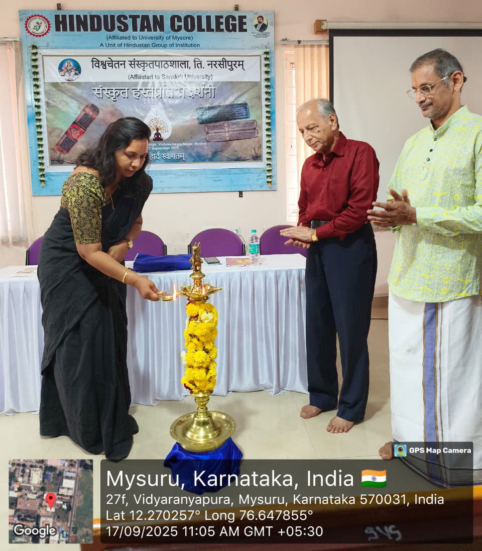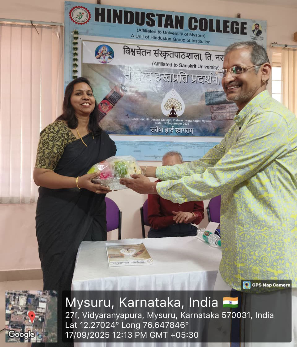 The Department of Languages (Sanskrit), in collaboration with Vishwa Chetana Sanskrita Pathashala (Affiliated to Sanskrit University), organized a display titled “Samskrita Hastaprati Pradarshini” on 17th Sep., 2025, at the college auditorium. The exhibition aimed to showcase the rich heritage of ancient Sanskrit manuscripts and promote awareness about their preservation and cultural significance. The event was inaugurated by Dr. H. V. Nagaraja Rao, a distinguished Sanskrit scholar, who emphasized the importance of digitization and conservation of palm-leaf manuscripts, copper plates, and handwritten scriptures for future generations. The display featured a variety of rare manuscripts, including palm-leaf texts, copper plate inscriptions, and illustrated works depicting mythological and cultural themes. The scholar explained the traditional techniques of manuscript writing and preservation. The event witnessed active participation from students, faculty members, and scholars, creating an atmosphere of academic curiosity and cultural appreciation.