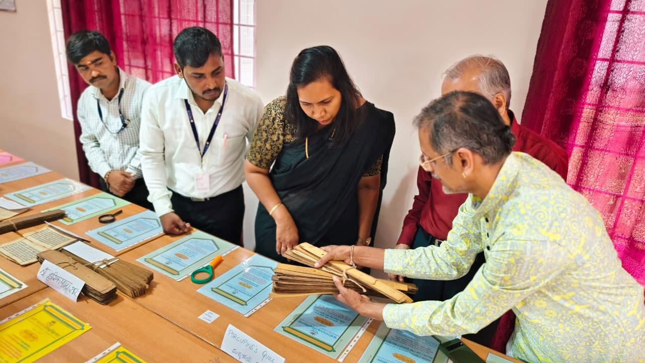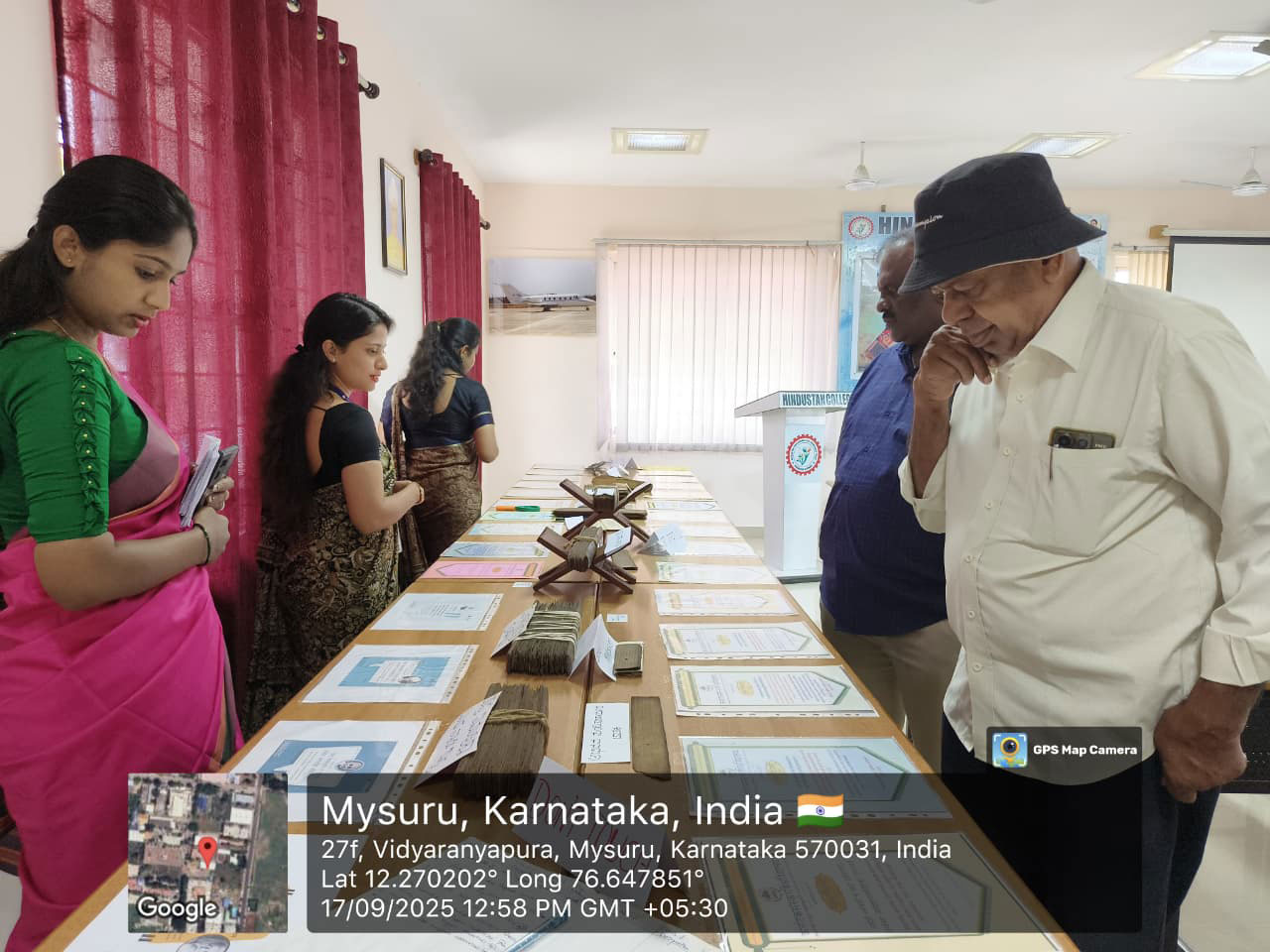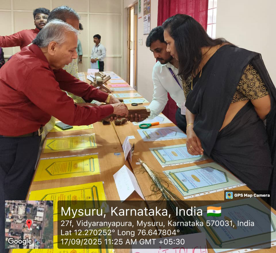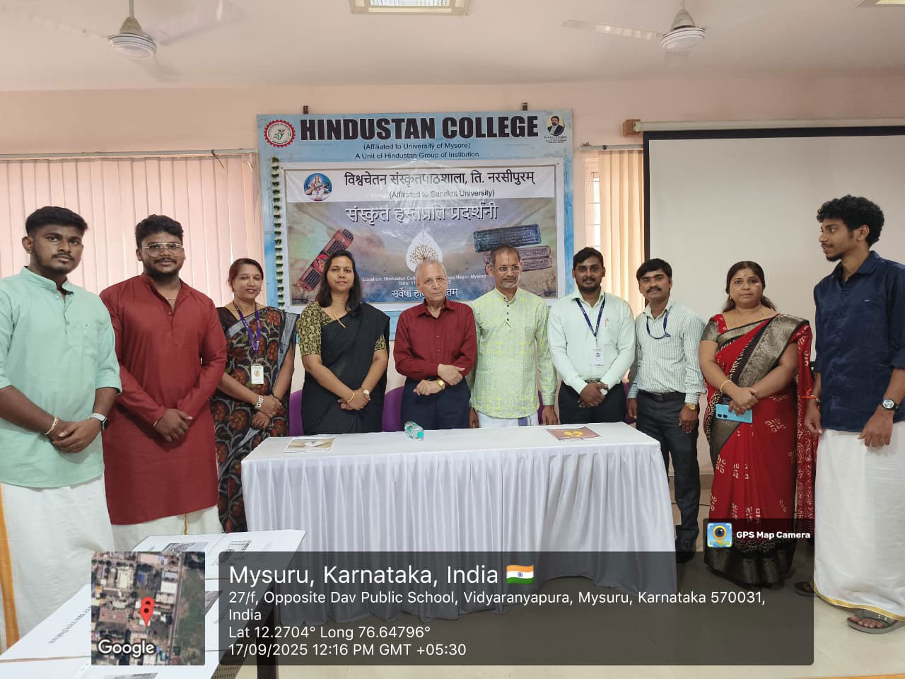 The Department of Languages (Sanskrit), in collaboration with Vishwa Chetana Sanskrita Pathashala (Affiliated to Sanskrit University), organized a display titled “Samskrita Hastaprati Pradarshini” on 17th Sep., 2025, at the college auditorium. The exhibition aimed to showcase the rich heritage of ancient Sanskrit manuscripts and promote awareness about their preservation and cultural significance. The event was inaugurated by Dr. H. V. Nagaraja Rao, a distinguished Sanskrit scholar, who emphasized the importance of digitization and conservation of palm-leaf manuscripts, copper plates, and handwritten scriptures for future generations. The display featured a variety of rare manuscripts, including palm-leaf texts, copper plate inscriptions, and illustrated works depicting mythological and cultural themes. The scholar explained the traditional techniques of manuscript writing and preservation. The event witnessed active participation from students, faculty members, and scholars, creating an atmosphere of academic curiosity and cultural appreciation.