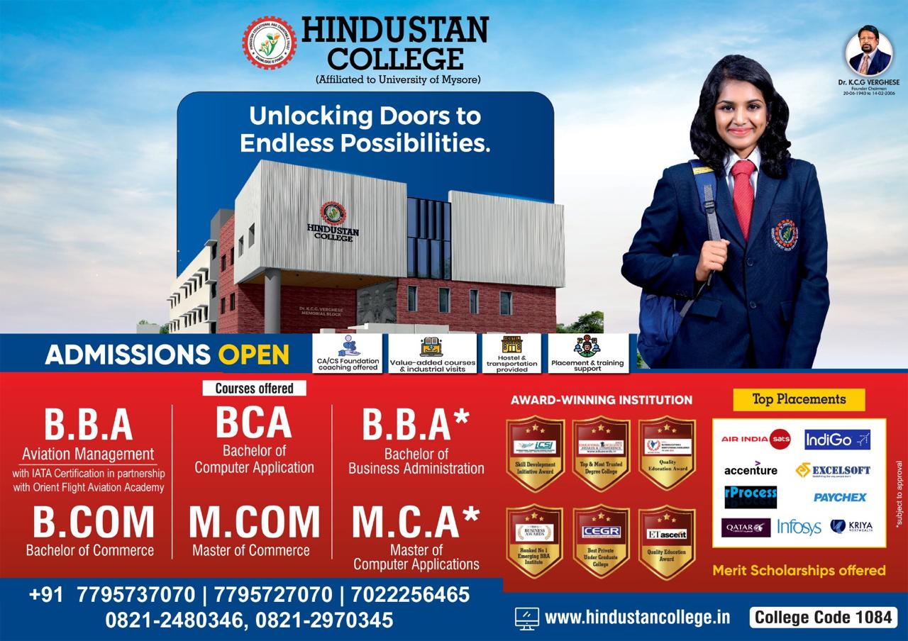 Hindustan College, Mysuru, which is affiliated to the University of Mysore, is presently offering B.Com, B.C.A Programs and Specialized programs in B.B.A in Aviation Management. With the vision of “Making every man a success and no man a failure”, Hindustan College is committed to delivering excellence in the field of education
